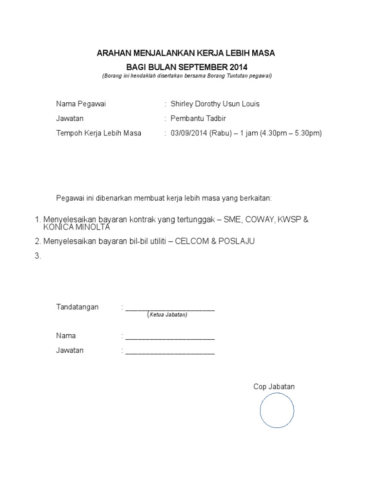 Contoh Surat Permohonan Kerja Lebih Masa have an image associated with the otherContoh Surat Permohonan Kerja Lebih Masa In addition it will include a picture of a kind that may be observed in the gallery of Contoh Surat Permohonan Kerja Lebih Masa. Ketua Jabatan hendaklah menandatangani borang tersebut merujuk kepada Seksyen 2B Akta Rahsia Rasmi 1972. Kerja lebih masa merupakan kerja-kerja rasmihakiki seseorang pegawai atau Jabatan yang dijalankan atas arahan Ketua Jabatan di luar waktu bekerja biasa yang telah ditetapkan pada Hari Rehat Mingguan Hari Kelepasan Mingguan atau pada Hari Kelepasan Am.